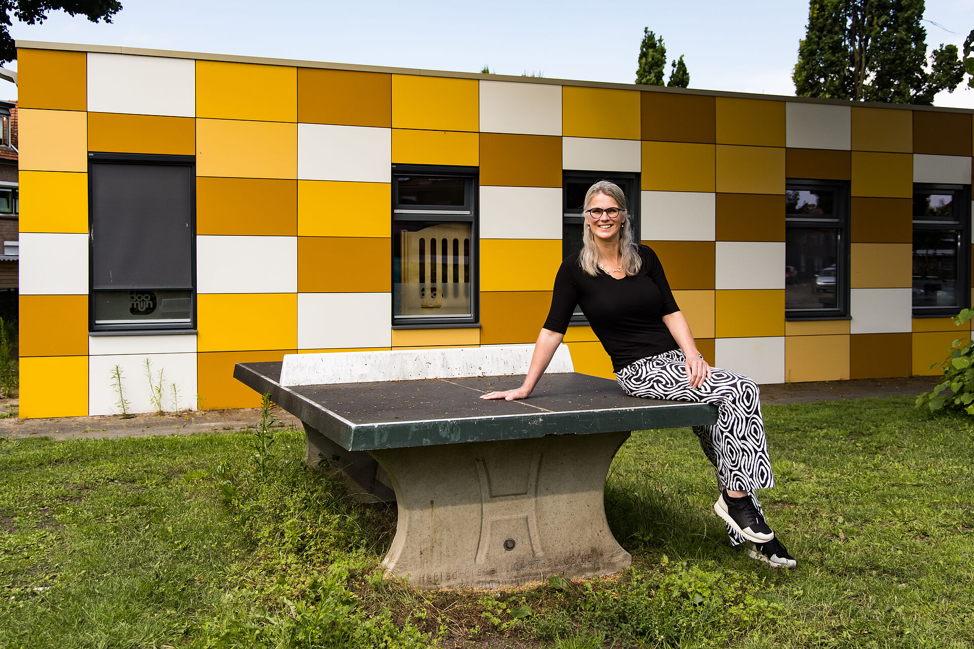 Ingrid staat bij een tafeltennistafel en vertelt: ‘Op deze foto zie je een tafeltennistafel. Die tafeltennistafel wordt maar weinig door de jongeren gebruikt. Dus men dacht ‘nou, dat is ook mooi, staat er een tafeltennistafel zodat de jeugd iets te doen heeft en dan wordt er geen gebruik van gemaakt’. Vanuit vooroordelen werd gedacht dat de jeugd liever binnen op de (spel)computer zit dan dat ze buiten bezig willen zijn. Wat hier alleen niet gebeurt, is dat men het gesprek aangaat met de jeugd over waaróm de tafeltennistafel niet gebruikt wordt.